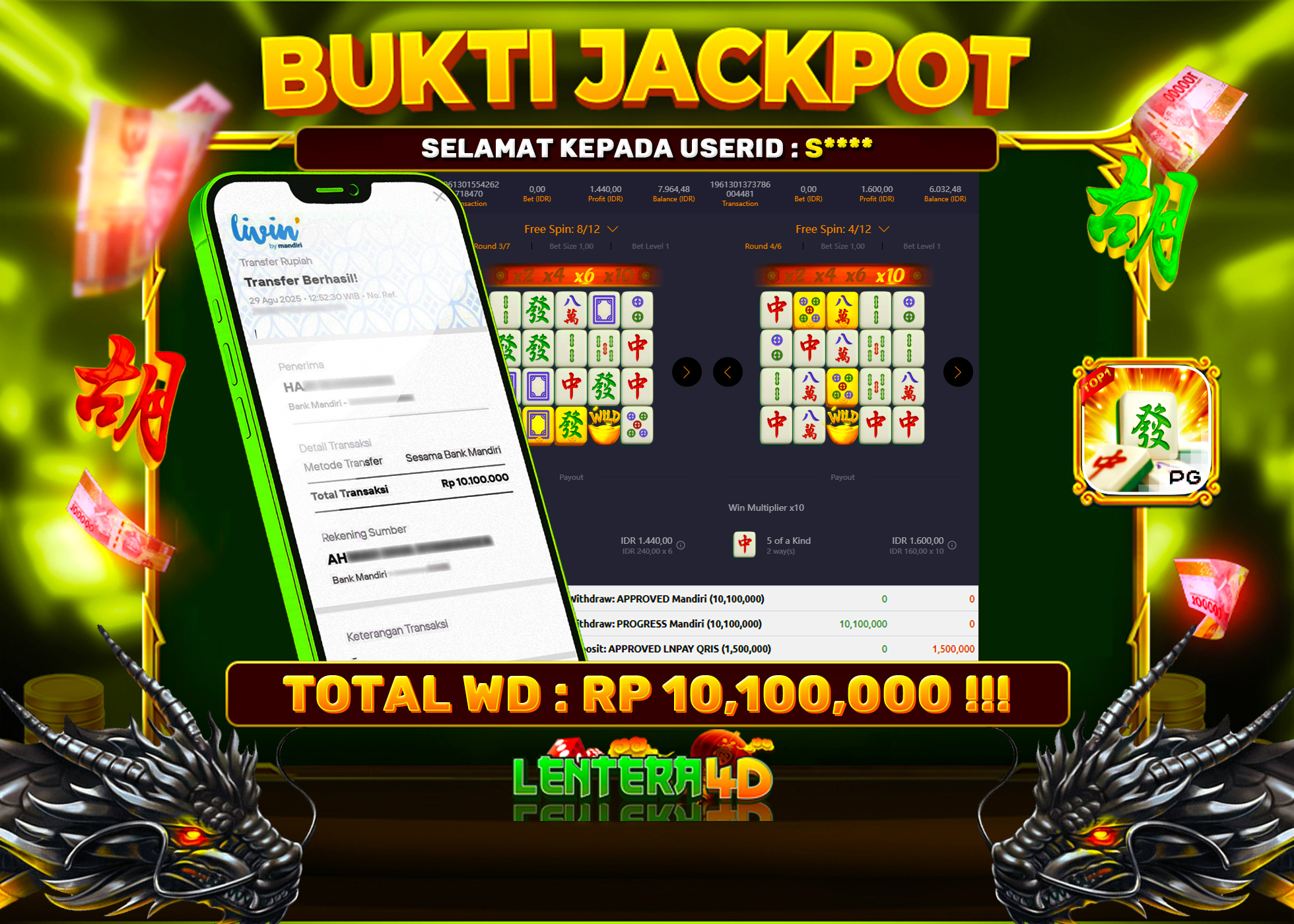 Setiap hari, member Lentera4D berhasil meraih jackpot besar dari berbagai provider slot ternama yang kami sediakan, seperti Pragmatic Play, Habanero, PG Soft, dan masih banyak lagi. Kami secara rutin menampilkan bukti screenshot atau rekapan kemenangan yang berhasil diraih, mulai dari kemenangan ratusan ribu hingga puluhan juta rupiah. Semua slip kemenangan ini kami hadirkan untuk membuktikan bahwa di Lentera4D, peluang menang itu nyata.
